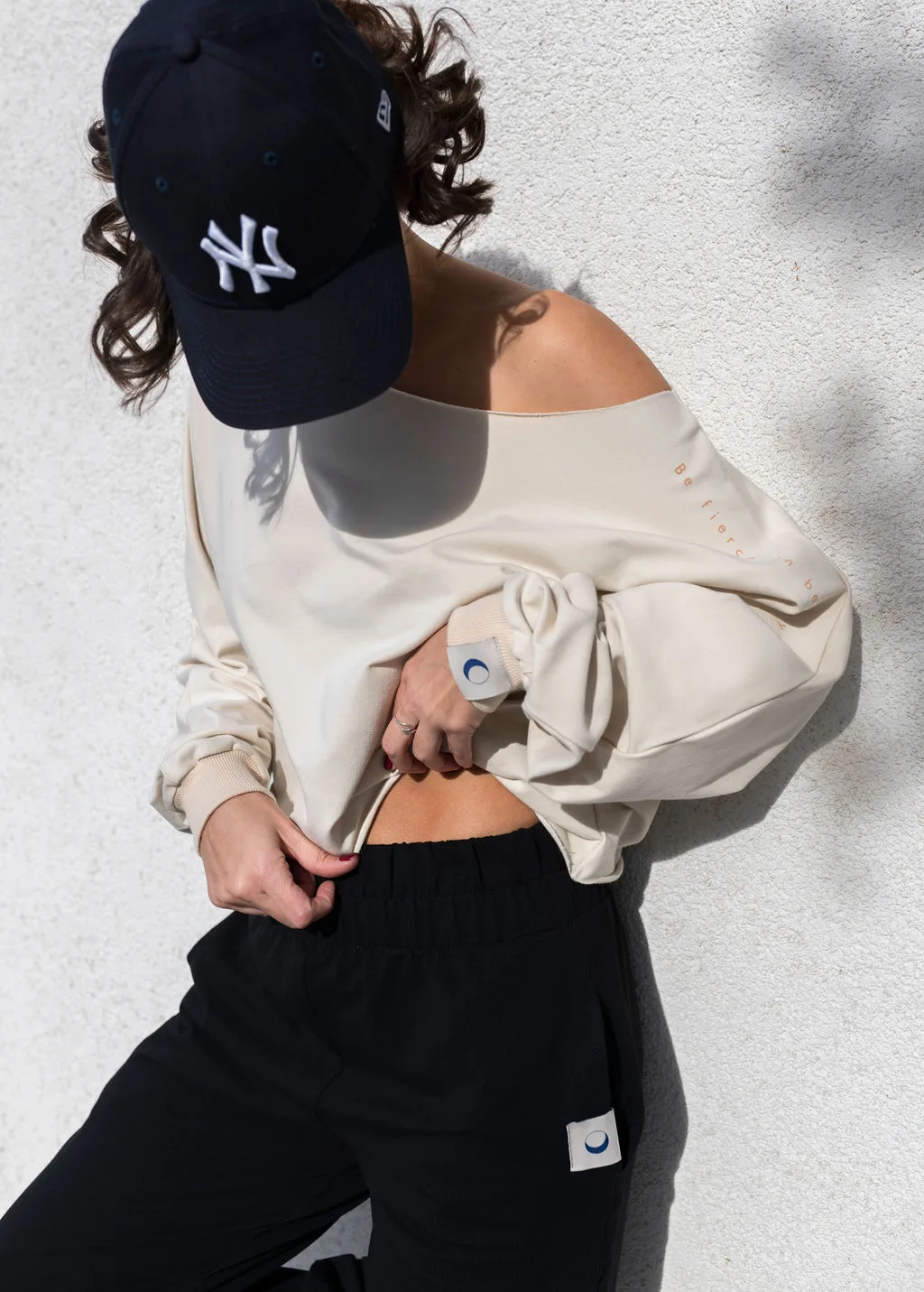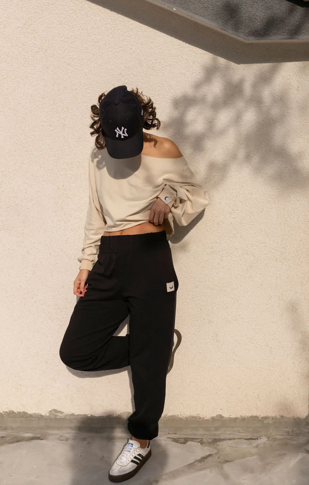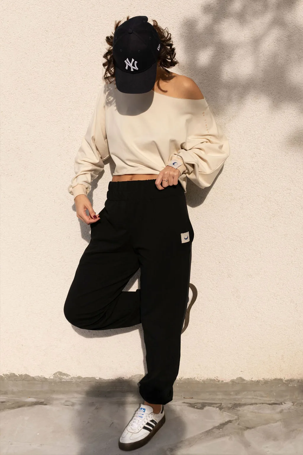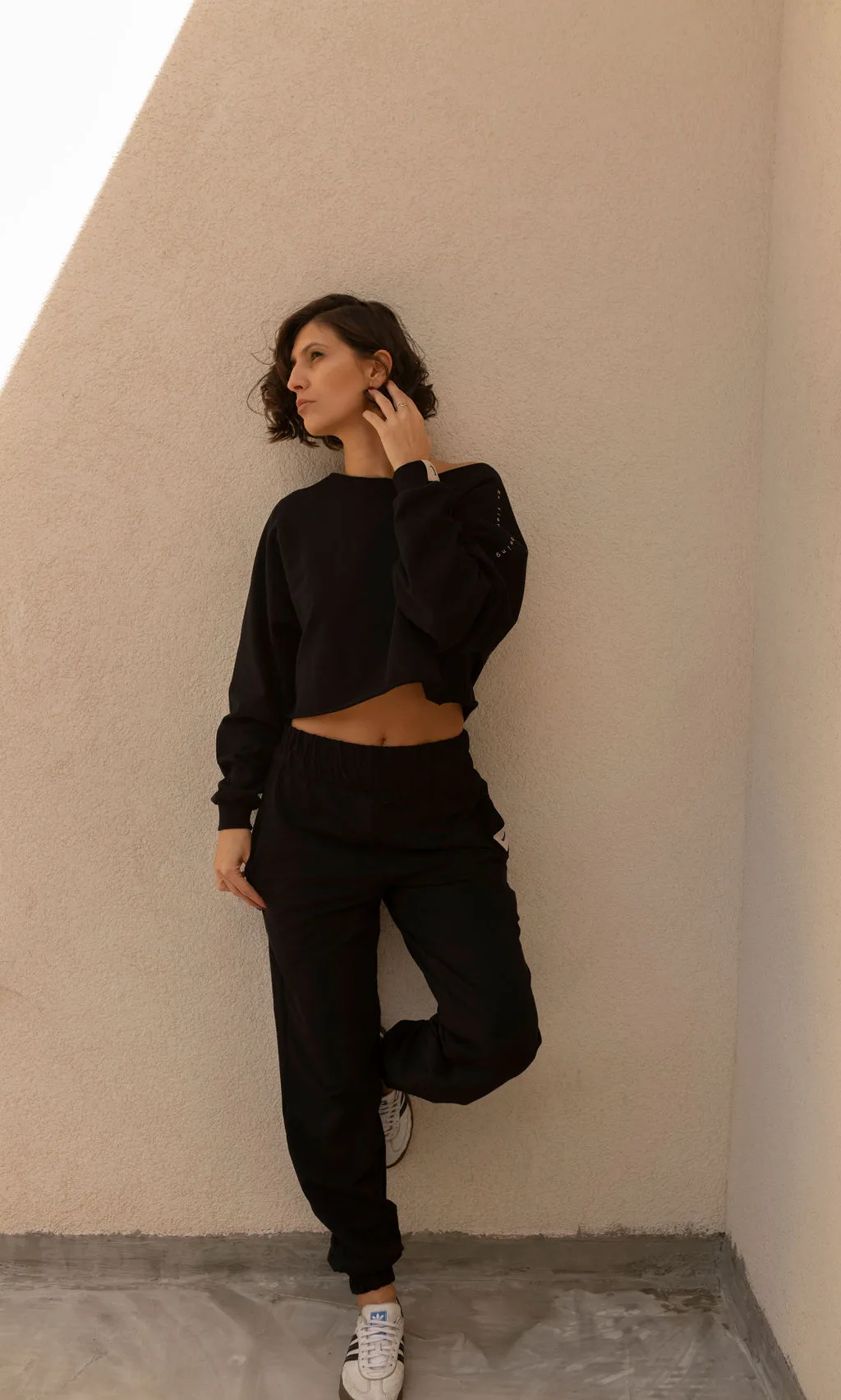 These bold black sweatpants are an ultra cozy piece in your wardrobe. Their high waist emphasizes your figure and you can adjust the length of the leggings how you choose.