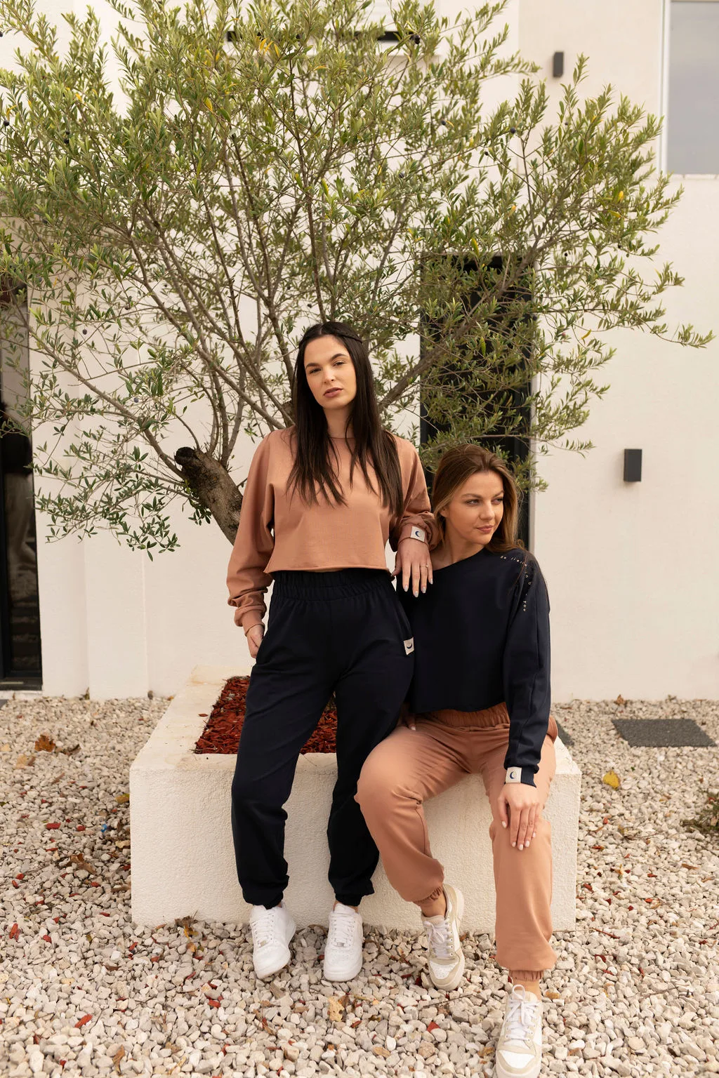 These navy sweatpants are an ultra cozy piece in your wardrobe. Their high waist emphasizes your figure and you can adjust the length of the leggings how you choose.