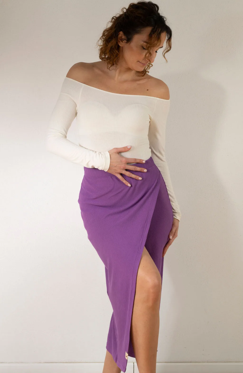This beautifully crafted midi skirt with a front slit. Whether paired with heels for a night out, styled with a blazer for work, or worn barefoot at home to indulge in its luxurious feel, this skirt is made to empower you—anytime, anywhere.