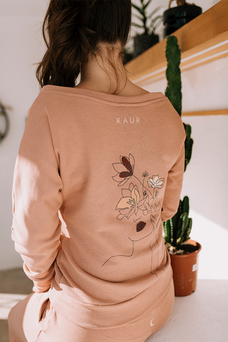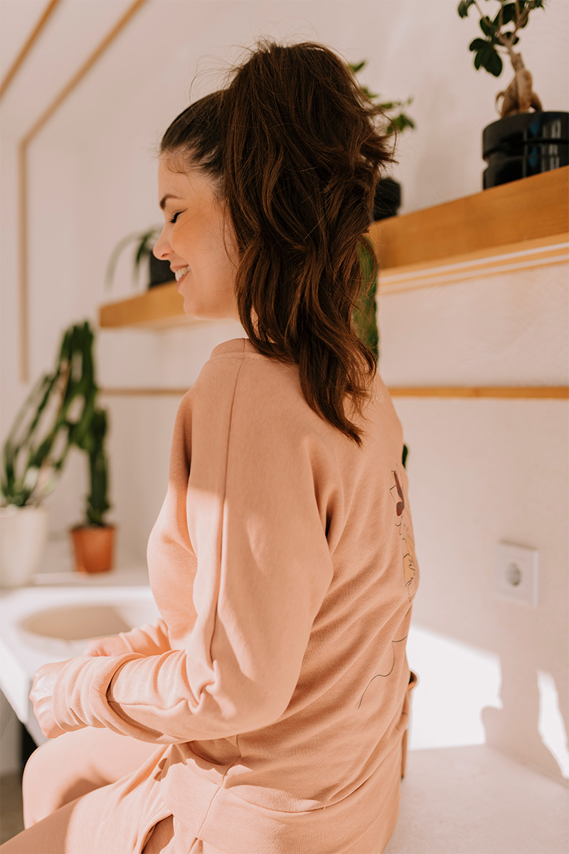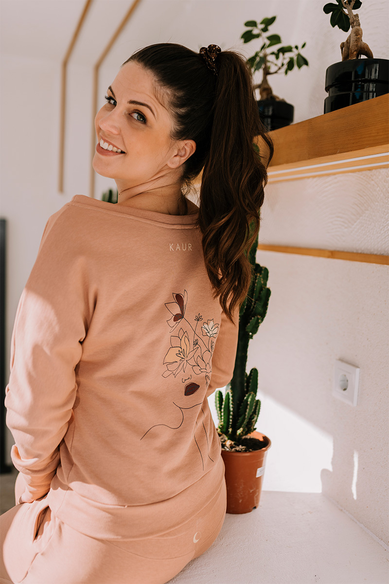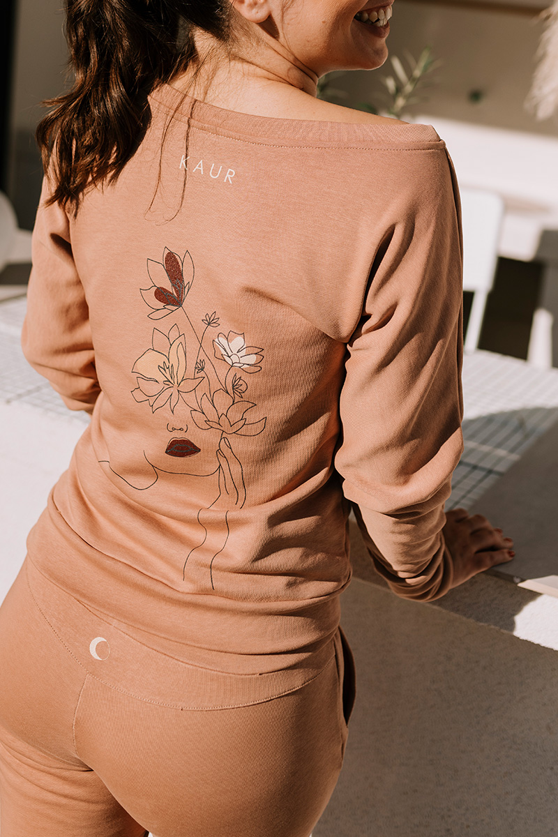 Elegant and comfy sweatshirt and jogger set with the tagline ‘Vibrate the Cosmos’ and beautiful print on the back of a mysterious girl being part of the Cosmos and being Cosmos herself.